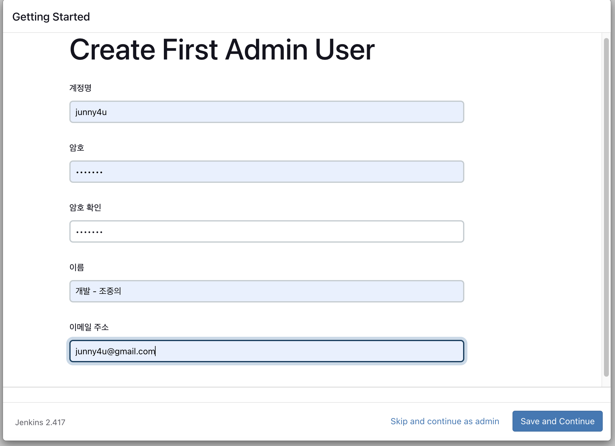 젠킨스 로그인시 사용할 관리자 계정이다. 추후에 일반 사용자의 계정은 따로 추가 할 수 있다.