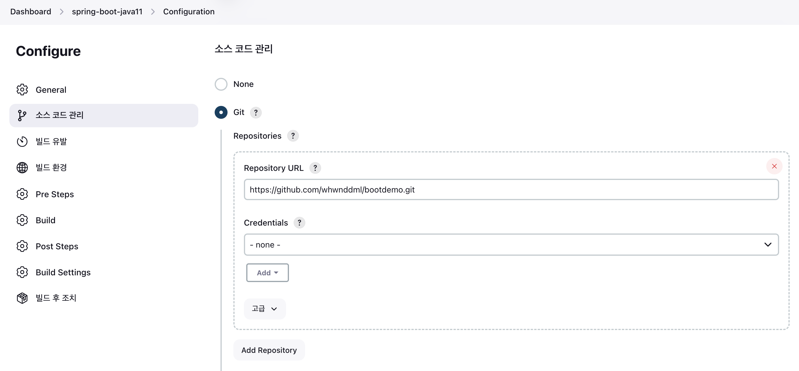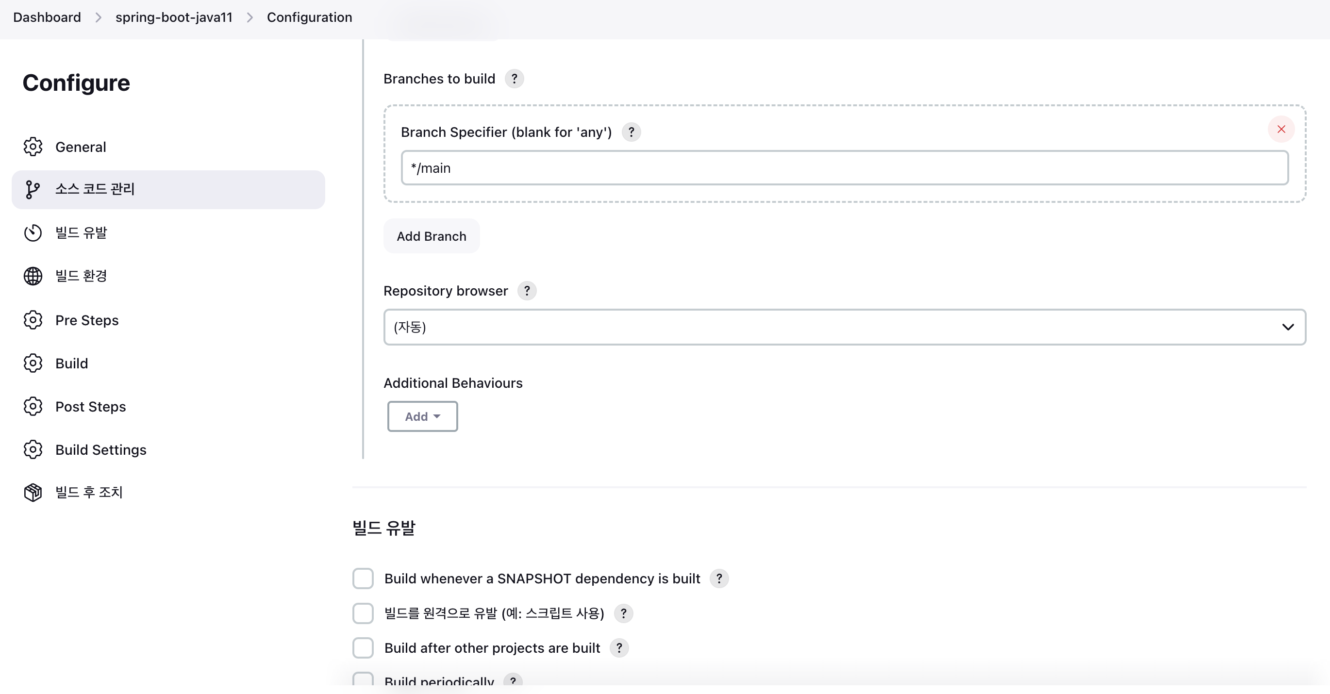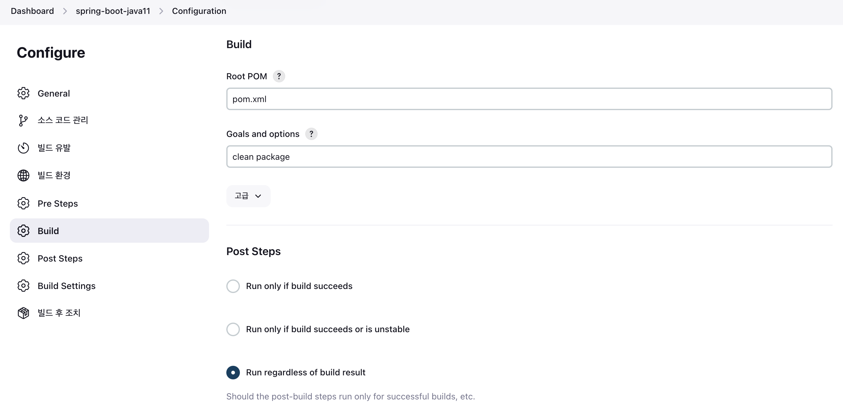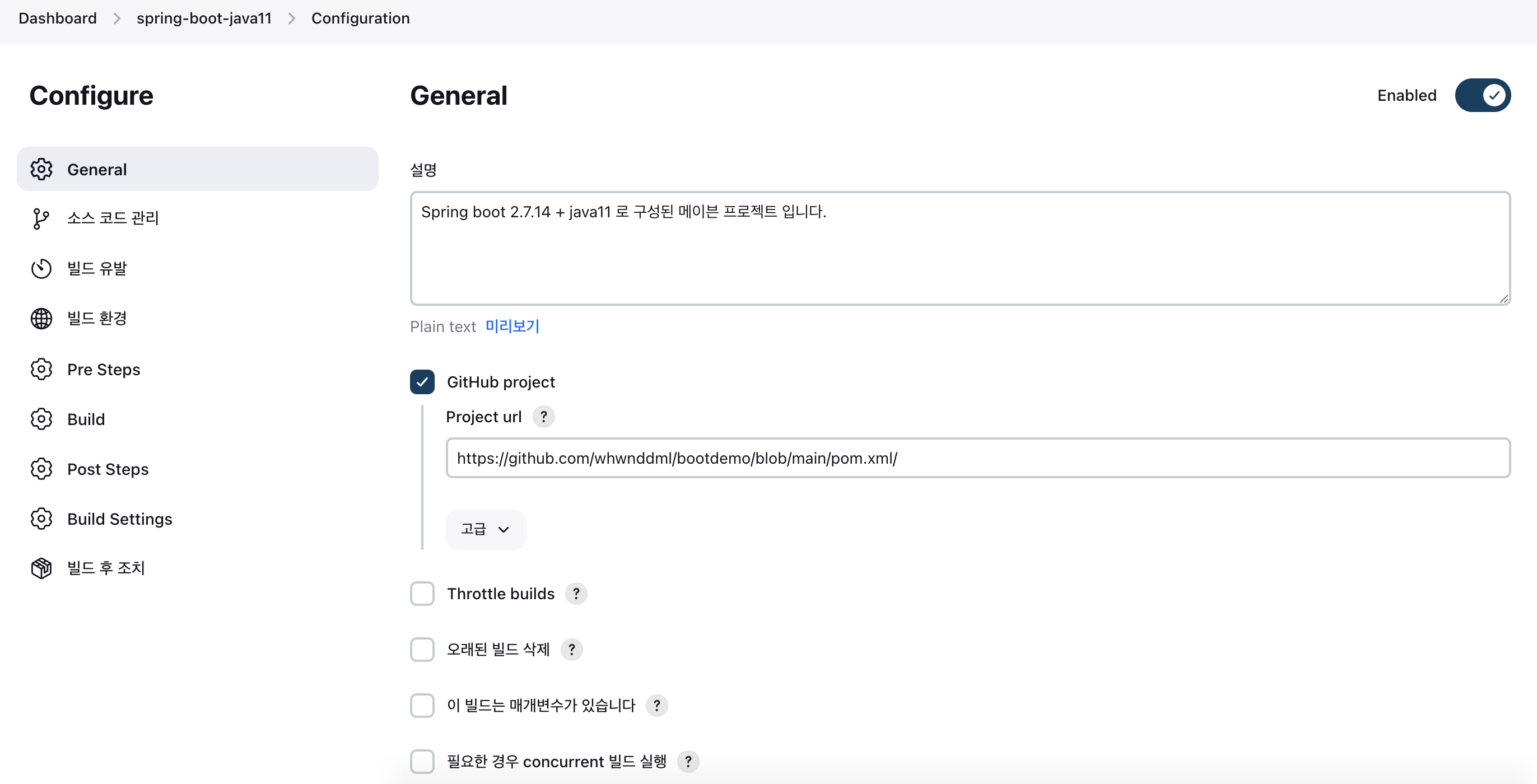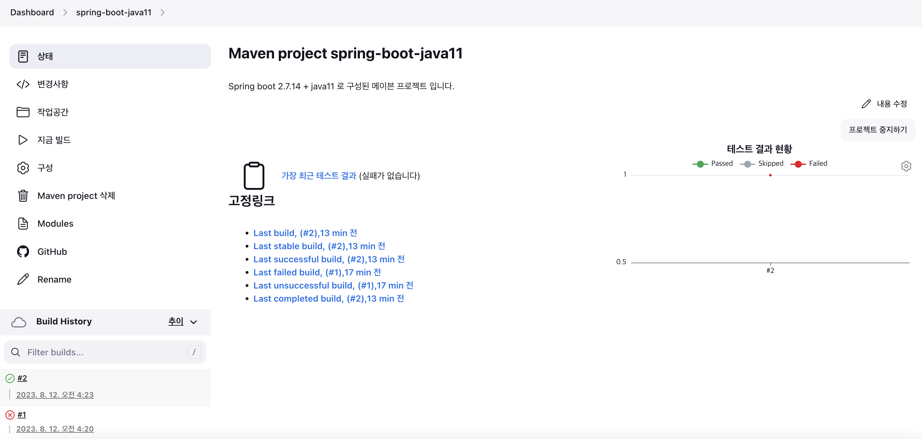 좌측의 '지금 빌드' 버튼 눌러 빌드가 정상적인 지 확인.