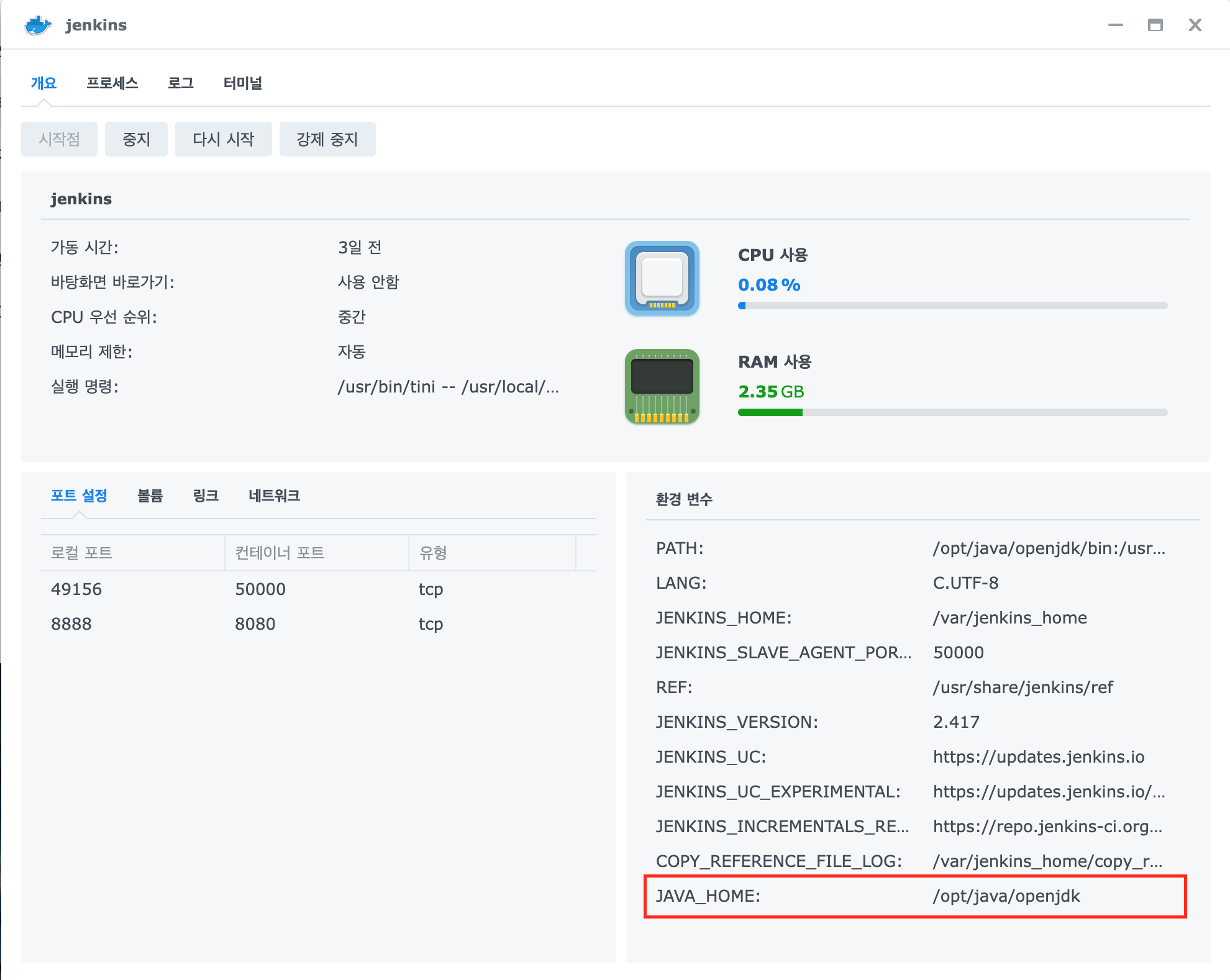 1) Synology 의 Docker 에서 JDK 경로 확인