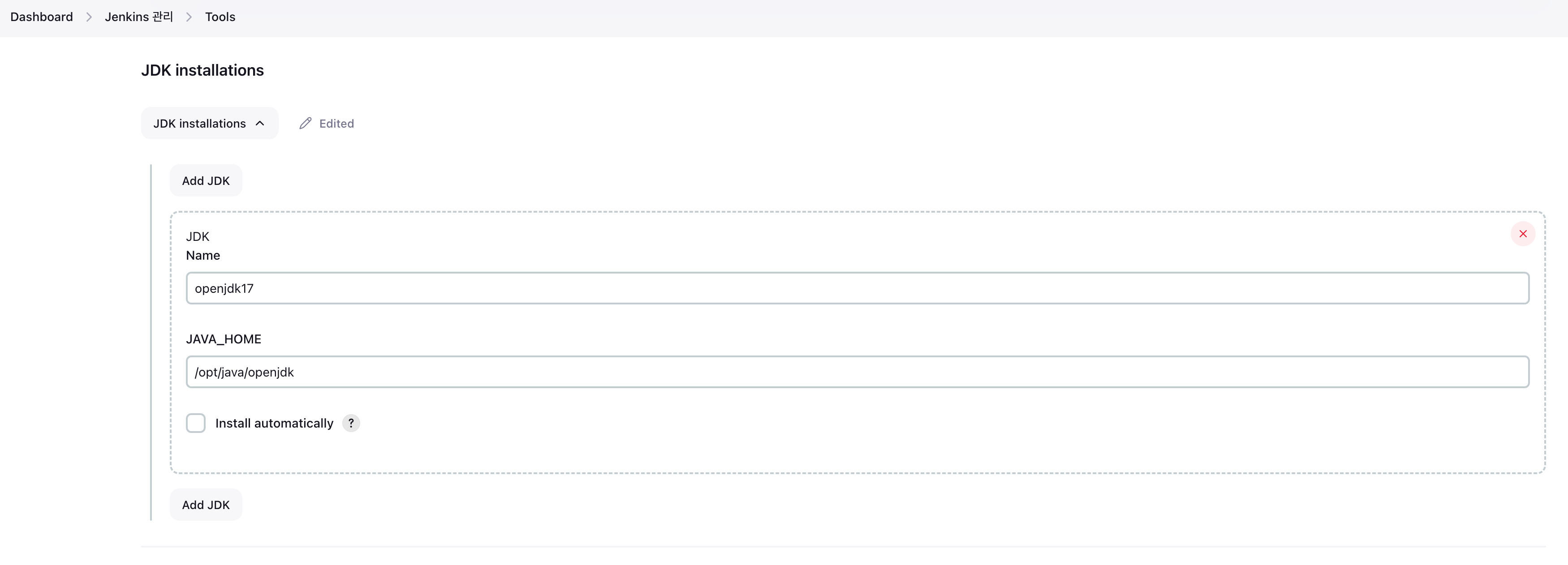 Docker 의 Jenkins 환경설정에서 jdk의 경로를 확인한다.