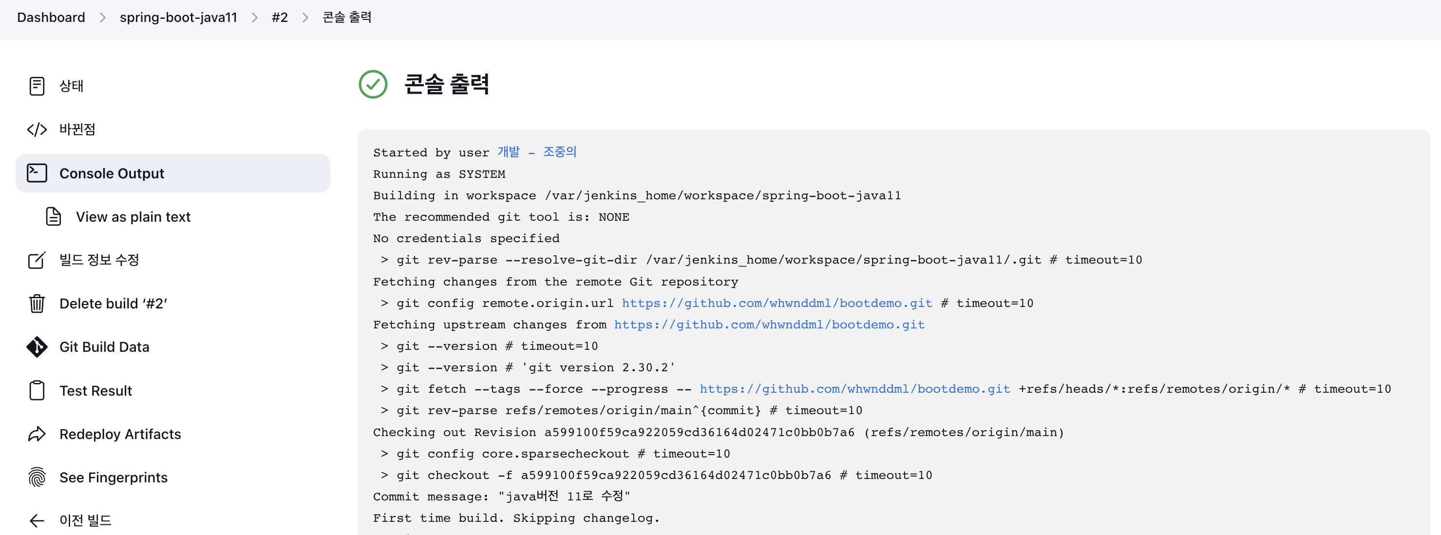 좌측 빌드 번호를 클릭하여 빌드된 상세 내용을 볼 수 있다.
