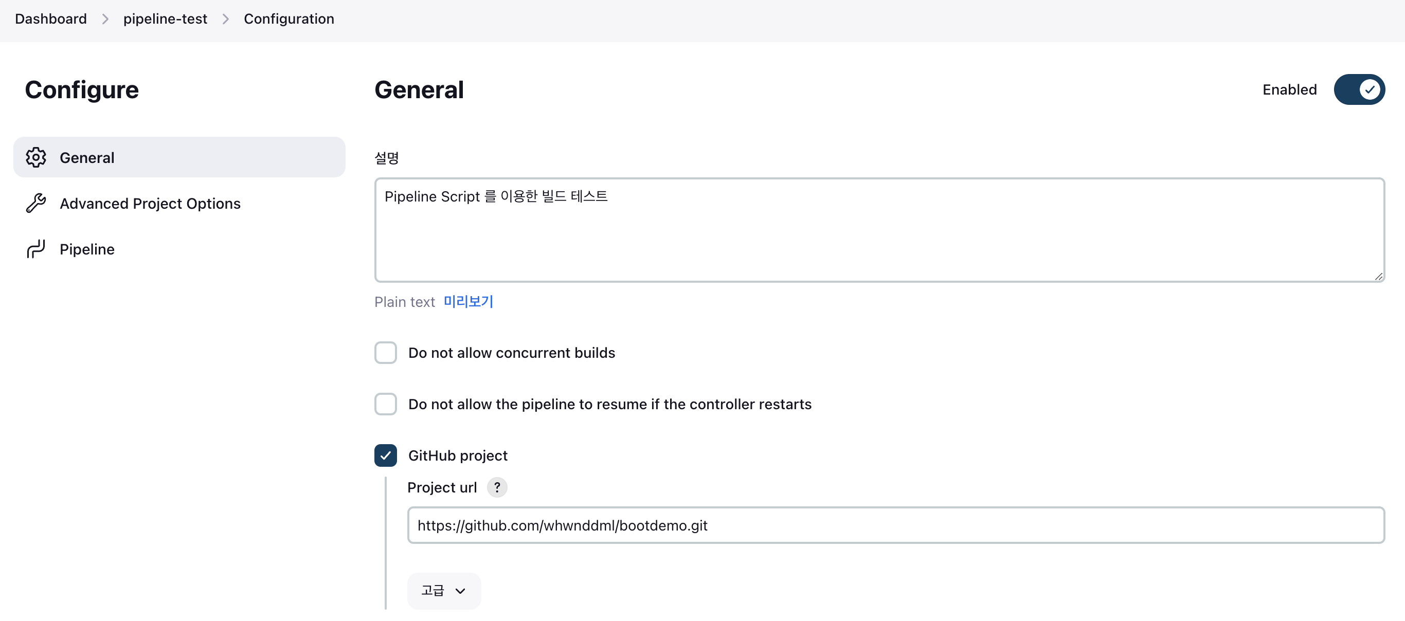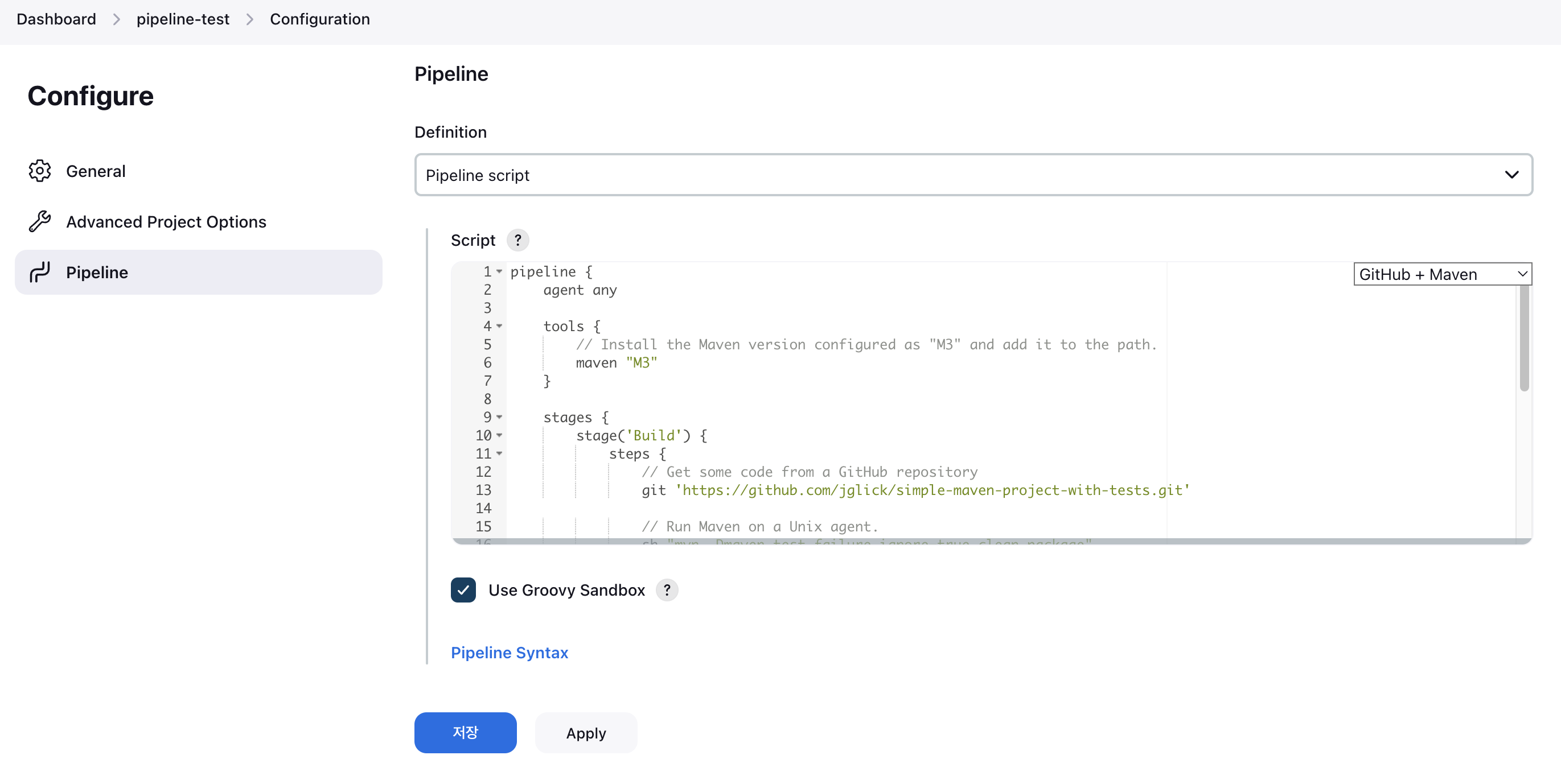 tools 의 Maven 항목은 젠킨스 Tools 설정에서 Maven Name으로 설정한 값을 입력한다.